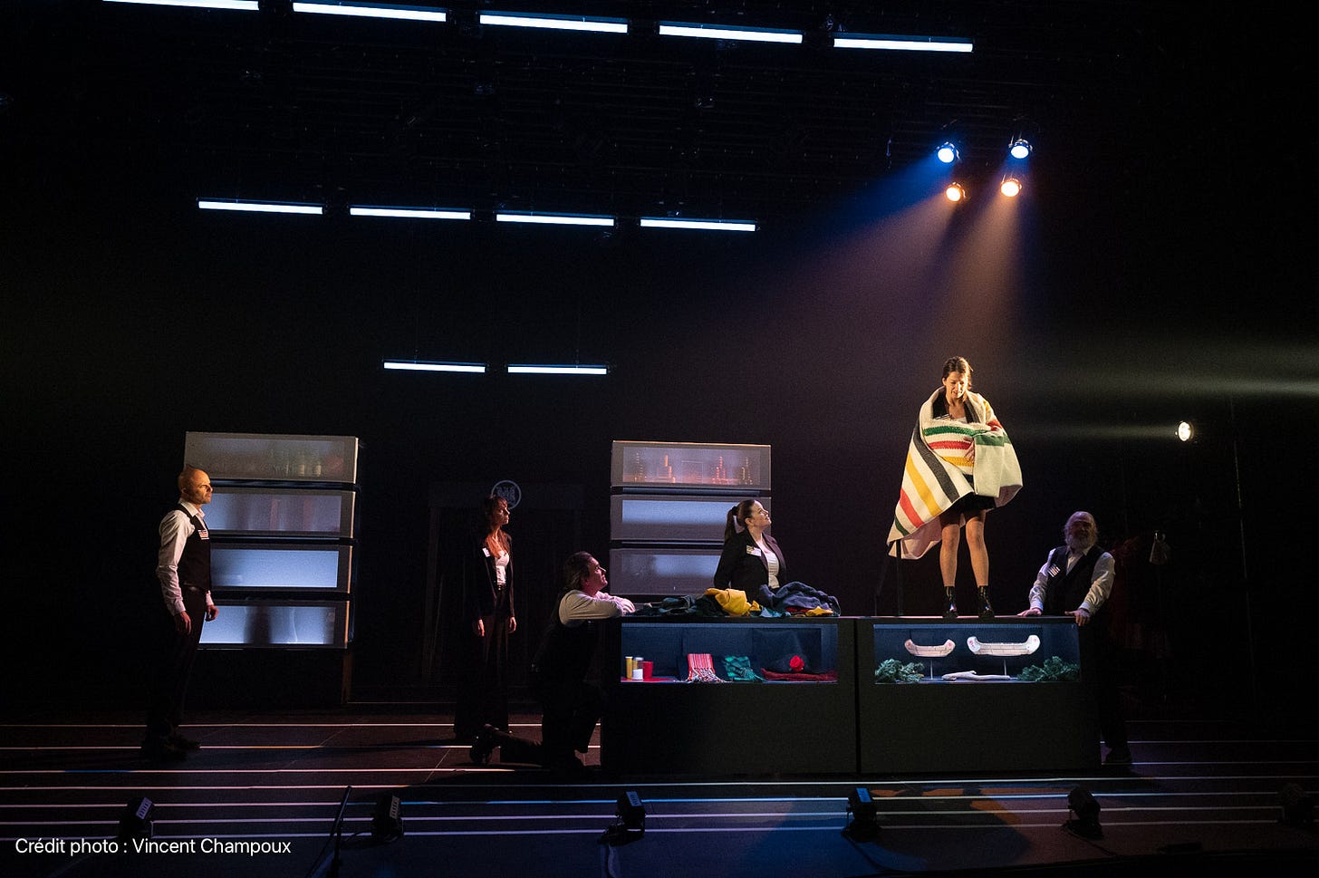 Alexis Martin opte pour une mise en scène dépouillée, presque austère, qui repose avant tout sur la puissance du récit et le talent des interprètes. Quelques objets suffisent à faire basculer l’espace d’un magasin contemporain à la forêt boréale d’il y a deux siècles. Les comis expliquent les personnages avant de les jouer, glissent d’une identité à l’autre, brisent le quatrième mur puis y reviennent, recréant un magasin à rayons… théâtral.