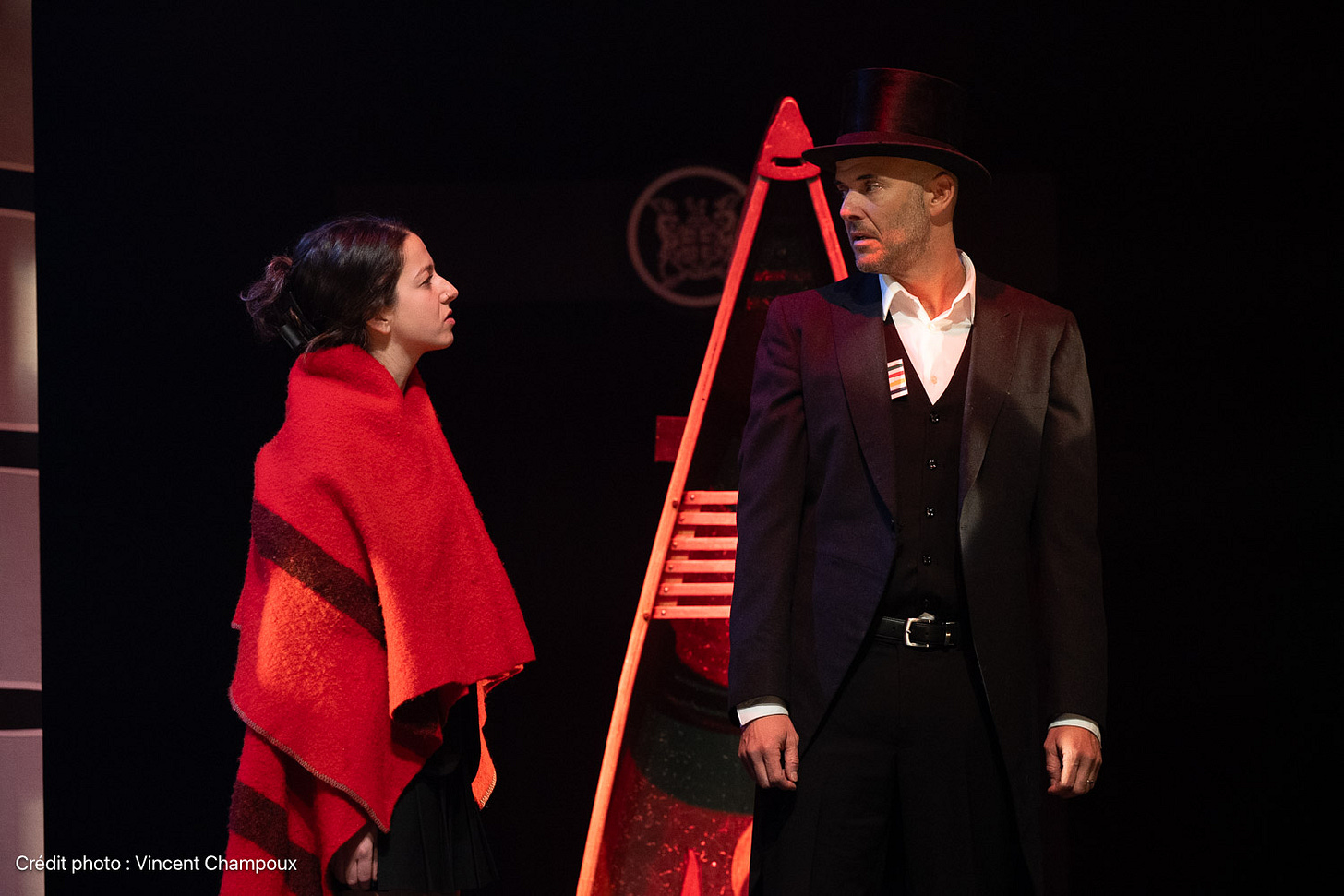 Le dispositif repose largement sur l’adresse directe au public. Le spectateur est constamment interpellé, inclus, parfois pris à partie. L’éclairage d’Émile Beauchemin joue un rôle symbolique fort: George Simpson demeure presque toujours dans la lumière, même lorsqu’il se tient en marge de la scène, comme s’il refusait toute disparition, toute relégation hors du champ.